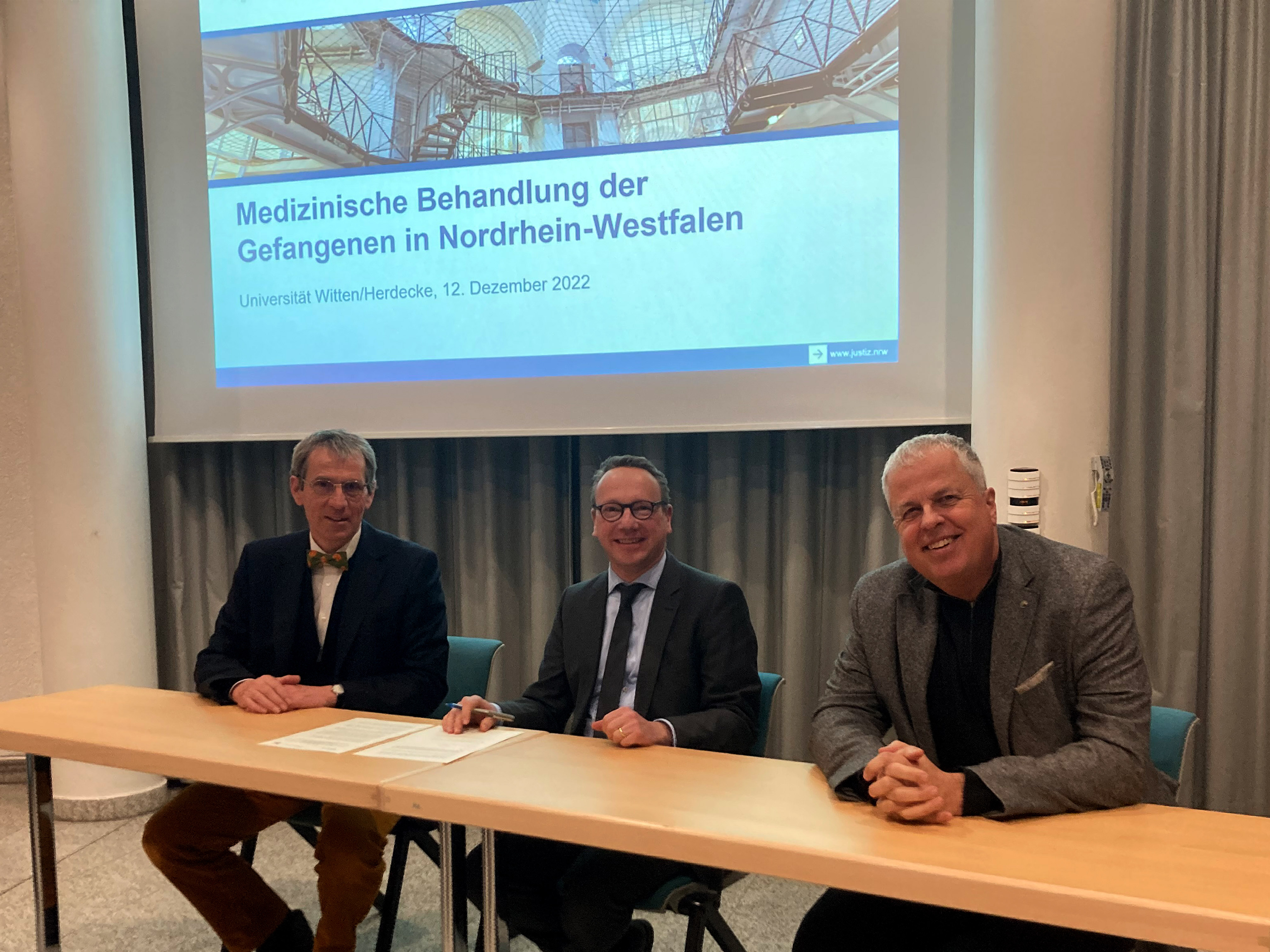Prof. Dr. med. Martin Butzlaff, Präsident der Universität Witten/Herdecke, betonte: „Entscheidend ist, dass Studierende in ihrer Ausbildung Rollenvorbilder kennenlernen, die ihnen einen Einblick in verschiedene Fachrichtungen geben. Einige unserer Studierenden hatten bereits die Möglichkeit, die Gesundheitsversorgung der Justizvollzugsanstalt in der Praxis kennenzulernen; diese Eindrücke haben sie nachhaltig geprägt. Die Zusammenarbeit mit dem Ministerium der Justiz ermöglicht es künftig all unseren angehenden Humanmedizinerinnen und -medizinern, sich das wichtige Feld der Gefängnismedizin und damit auch neue Berufsperspektiven zu erschließen.“