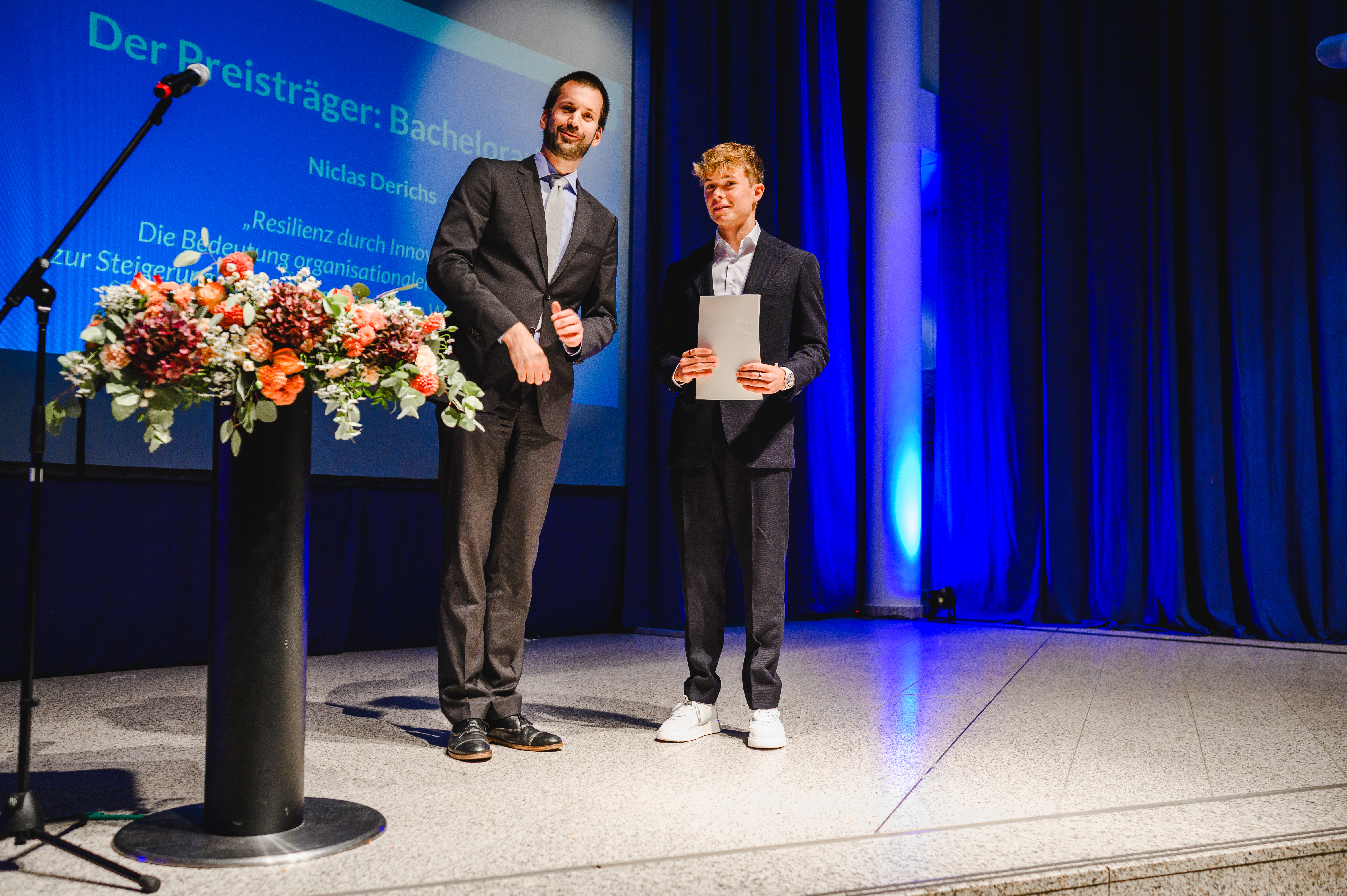 Niclas Derichs dealt with the topic of "The importance of organisational innovation to increase entrepreneurial resilience in the context of global economic challenges" in his final thesis in the Management (B. Sc.) degree programme. Companies must continuously adapt to technological and market-related changes in order to be successful in the long term. The study shows that innovative strength - particularly in the development of new products and processes - is crucial to ensuring economic stability and resilience. The study also finds that small, agile companies are more likely to drive innovation; large companies scale these innovations and apply them on a larger scale.