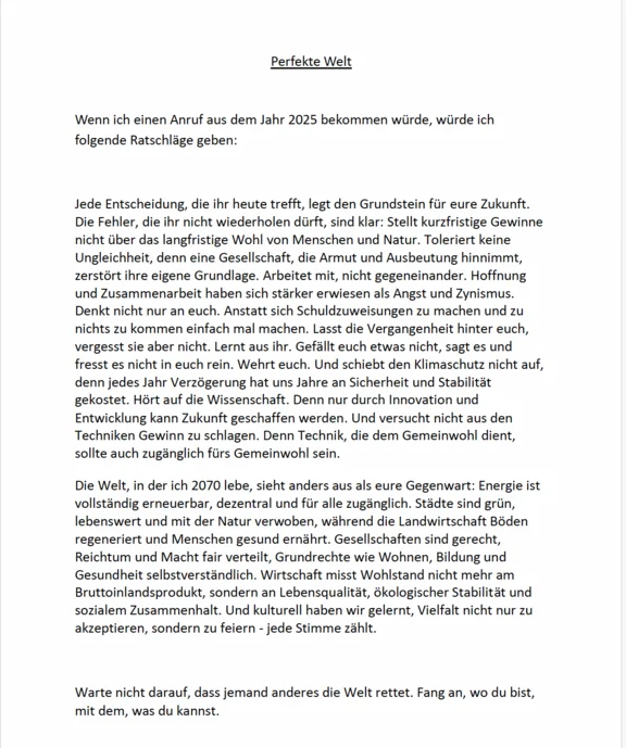 Stell dir vor: Es ist das Jahr 2070 und du lebst in einer nachhaltigen und gerechten Welt. Wie sieht diese aus - und wie sind wir dorthin gekommen?