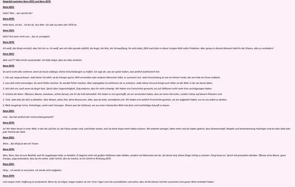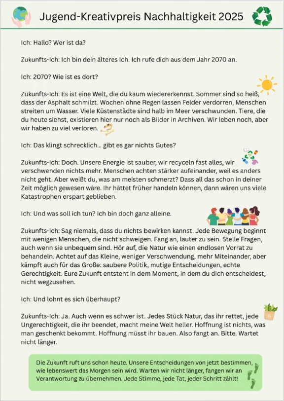 Mit diesen Fragen lud der Jugendkreativpreis zu einer kreativen und kritischen Auseinandersetzung mit Gegenwart und Zukunft ein. Die Teilnehmer:innen waren aufgefordert, sich in das Jahr 2070 zu versetzen und aus dieser Zukunftsperspektive einen Ratschlag an eine Person der Gegenwart zu formulieren. Die Vielfalt der eingereichten Beiträge – von Collagen über poetische Texte bis hin zu inszenierten Telefonaten – hat uns begeistert.