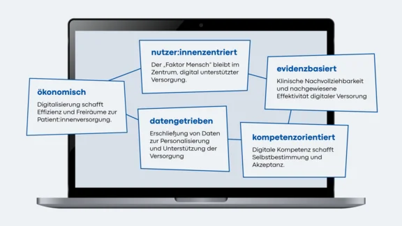 Das ZDITG orientiert sich an den fünf Grundsätzen - der Nutzer:innenzentrierung, Datengetriebenheit, Evidenzbasierung, Ökonomie und Kompetenzorientierung - in der digitalen Gesundheitsversorgung und Gesundheitswirtschaft.