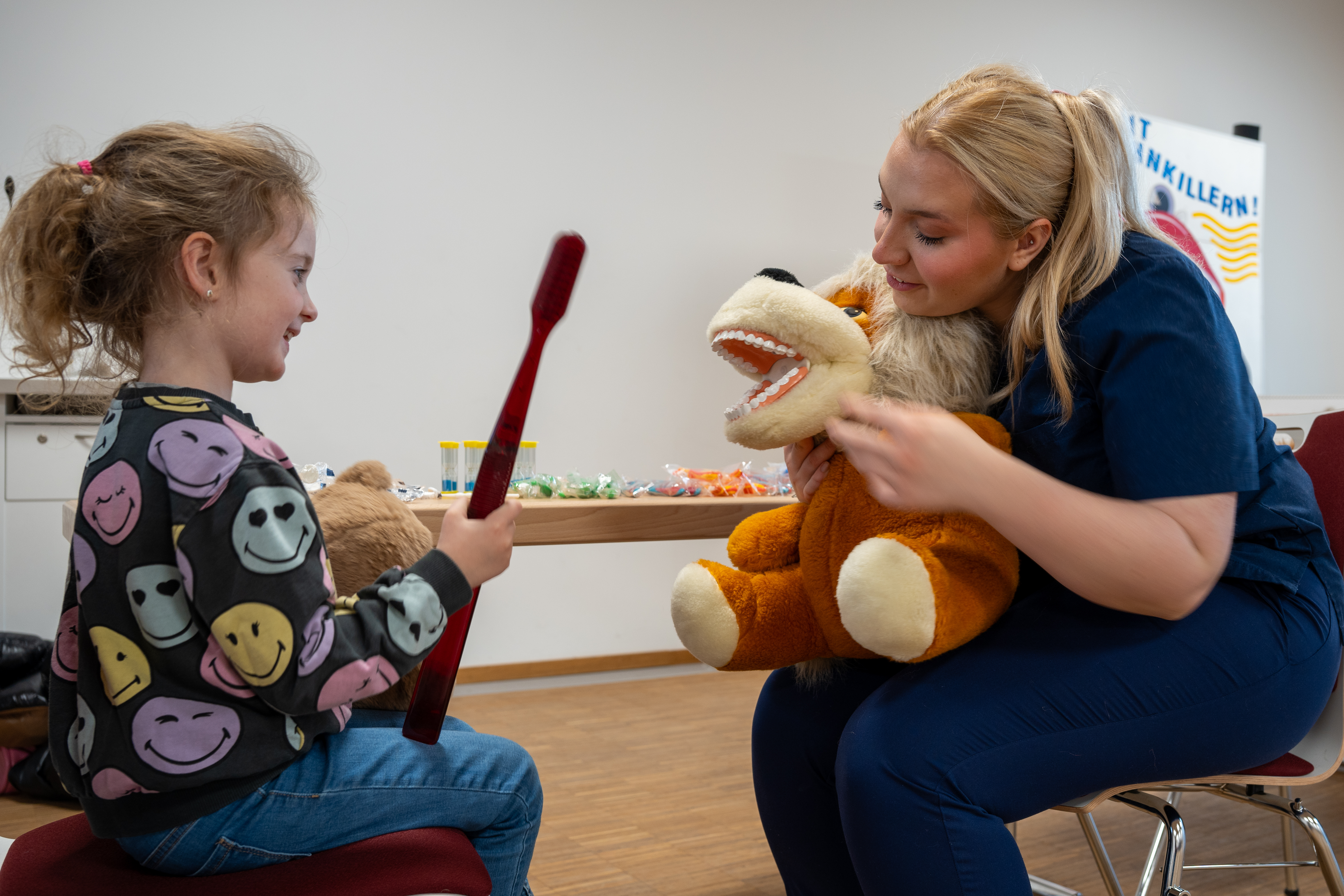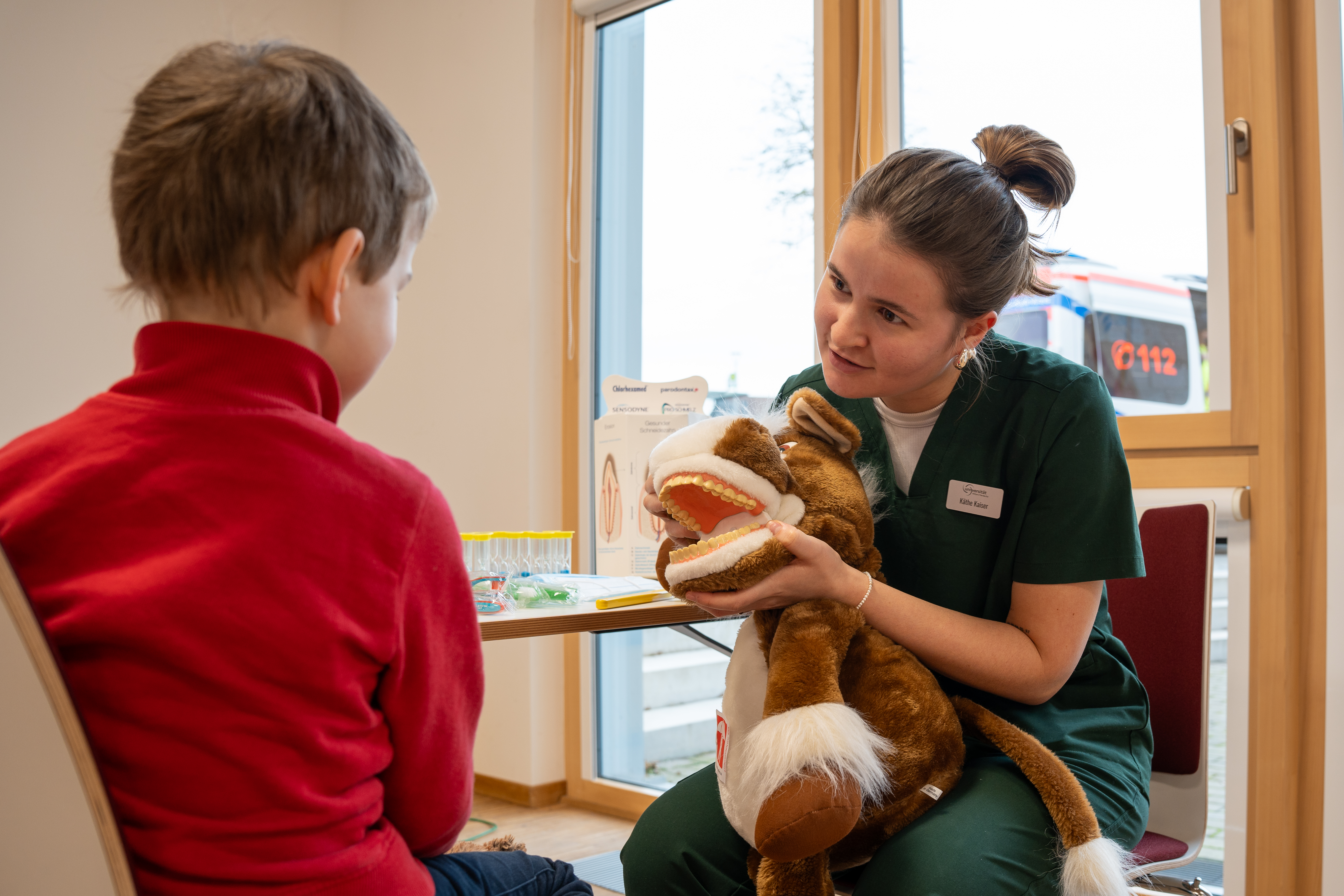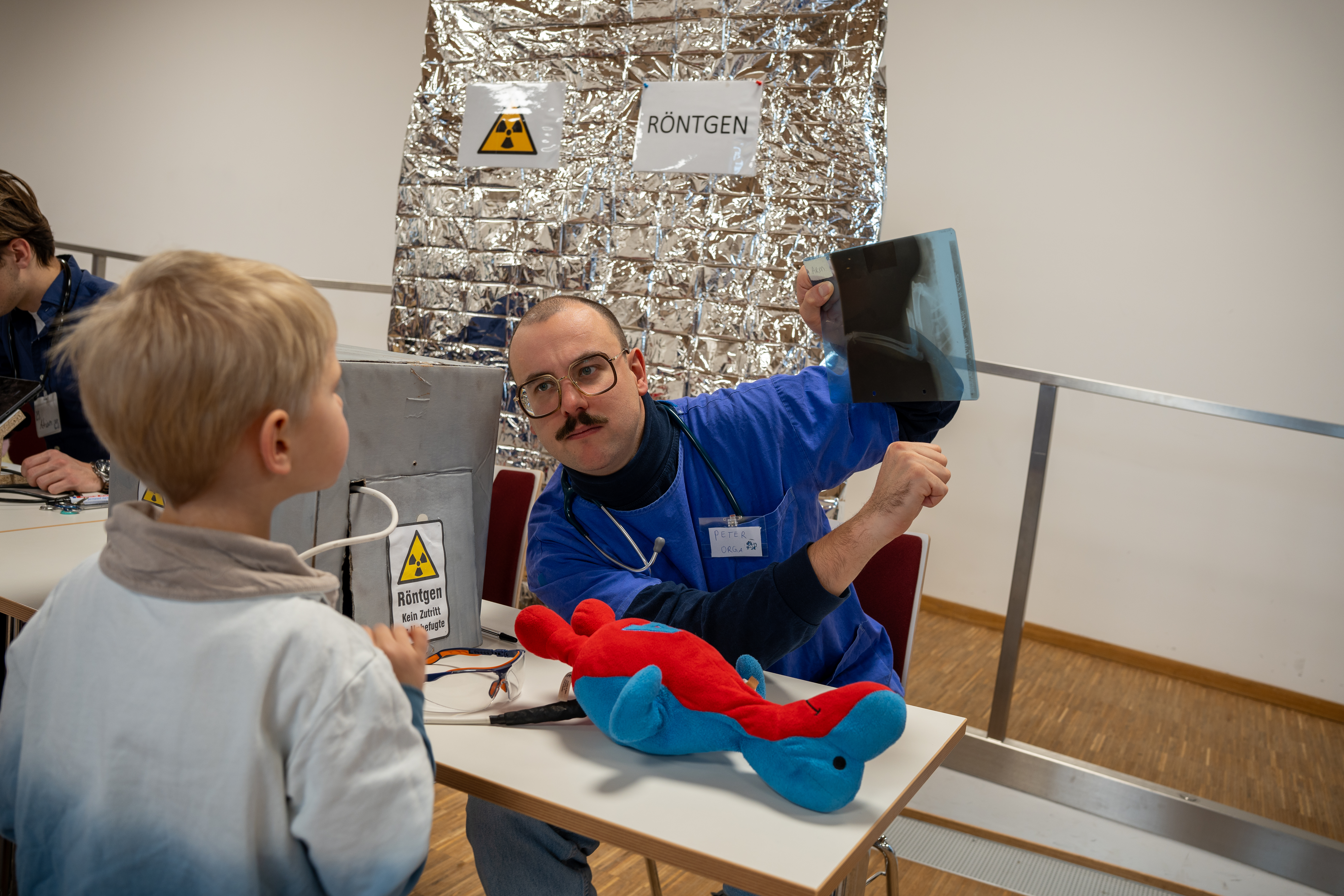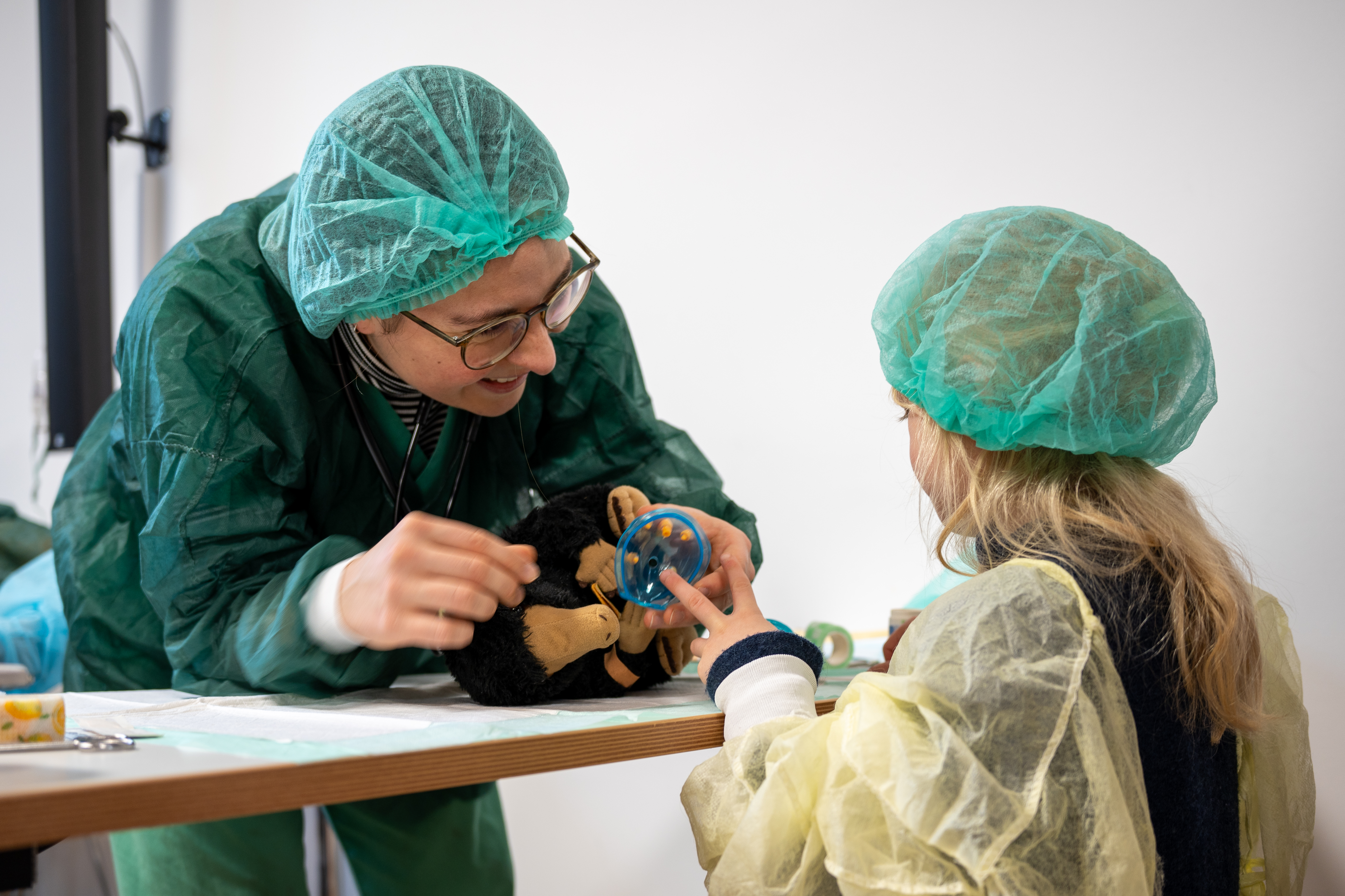 Teddybären mit gebrochenen Pfoten, Hasen mit schmerzenden Bäuchen und Tiger mit entzündeten Krallen wurden liebevoll behandelt und die jungen Besitzer:innen durften dabei selbst als „Assistenzärzt:innen“ mitwirken. Hierbei schlüpfen die Kinder spielerisch in die Rolle, die ihre Eltern sonst übernehmen, wenn es um den Besuch der (zahn-)ärztlichen Praxis oder des Krankenhauses geht.