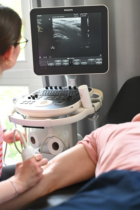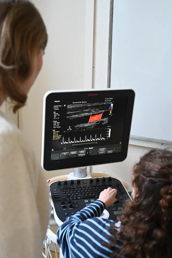 Seit dem Sommersemester 2025 haben Studierende bereits zu Beginn ihres Studiums die Möglichkeit, mit dem diagnostischen Tool des Ultraschalls frühzeitig in Kontakt zu kommen und die Anatomie angewandt zu festigen. Begleitende Forschungsprojekte und natürlich das Feedback aller Vorkliniker*innen sollen dieses in Deutschland nahezu einmalige Angebot stetig weiterentwickeln. Du hast in deiner POL-Woche die komplexe Anatomie des Plexus brachialis noch nicht ganz verstanden? Dann wird es Zeit, sich dessen Verlauf mal mit dem Ultraschall anzuschauen! (Sono meets POL im 3. Semester) - Stärkung des Ultraschall-Standortes in Witten: