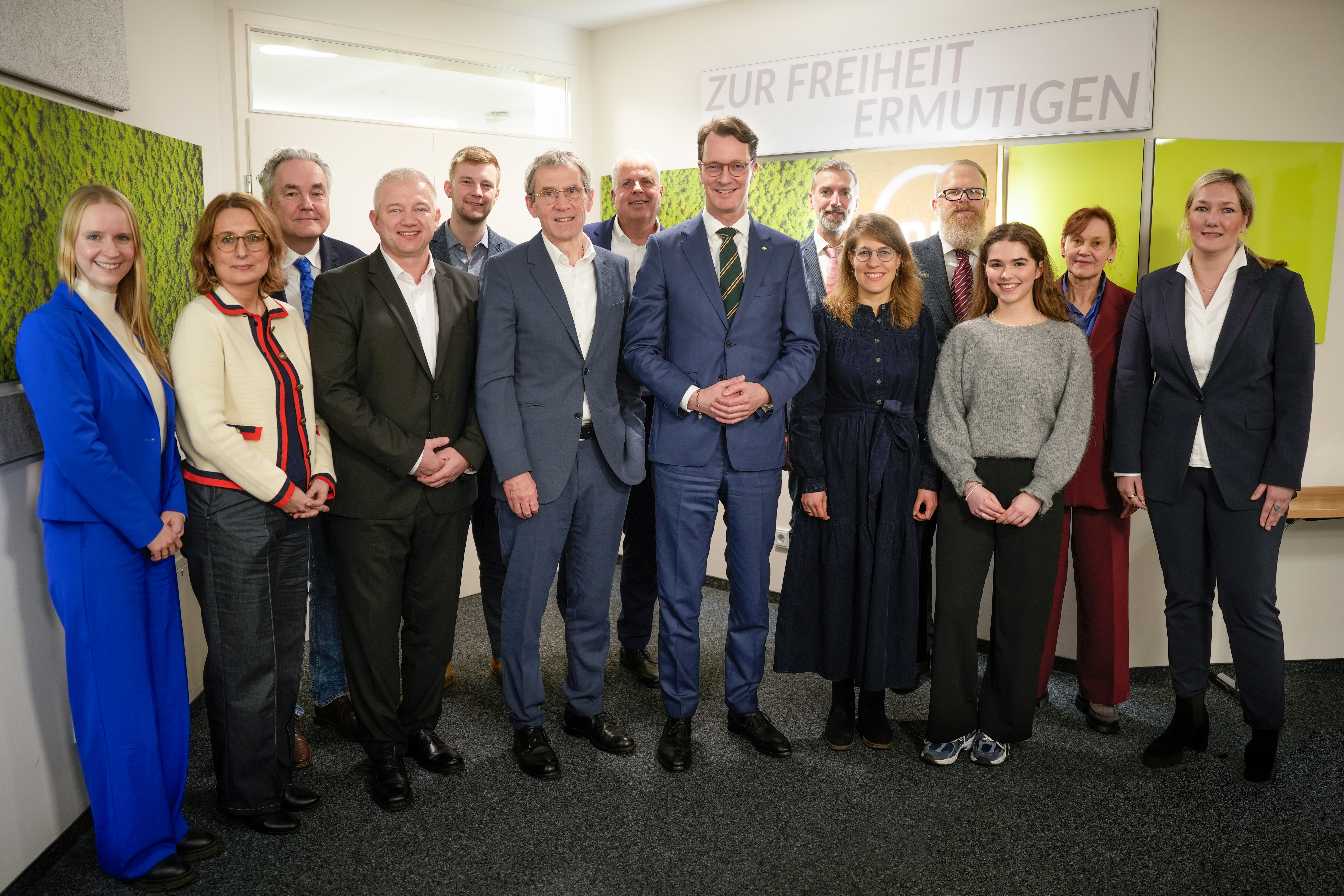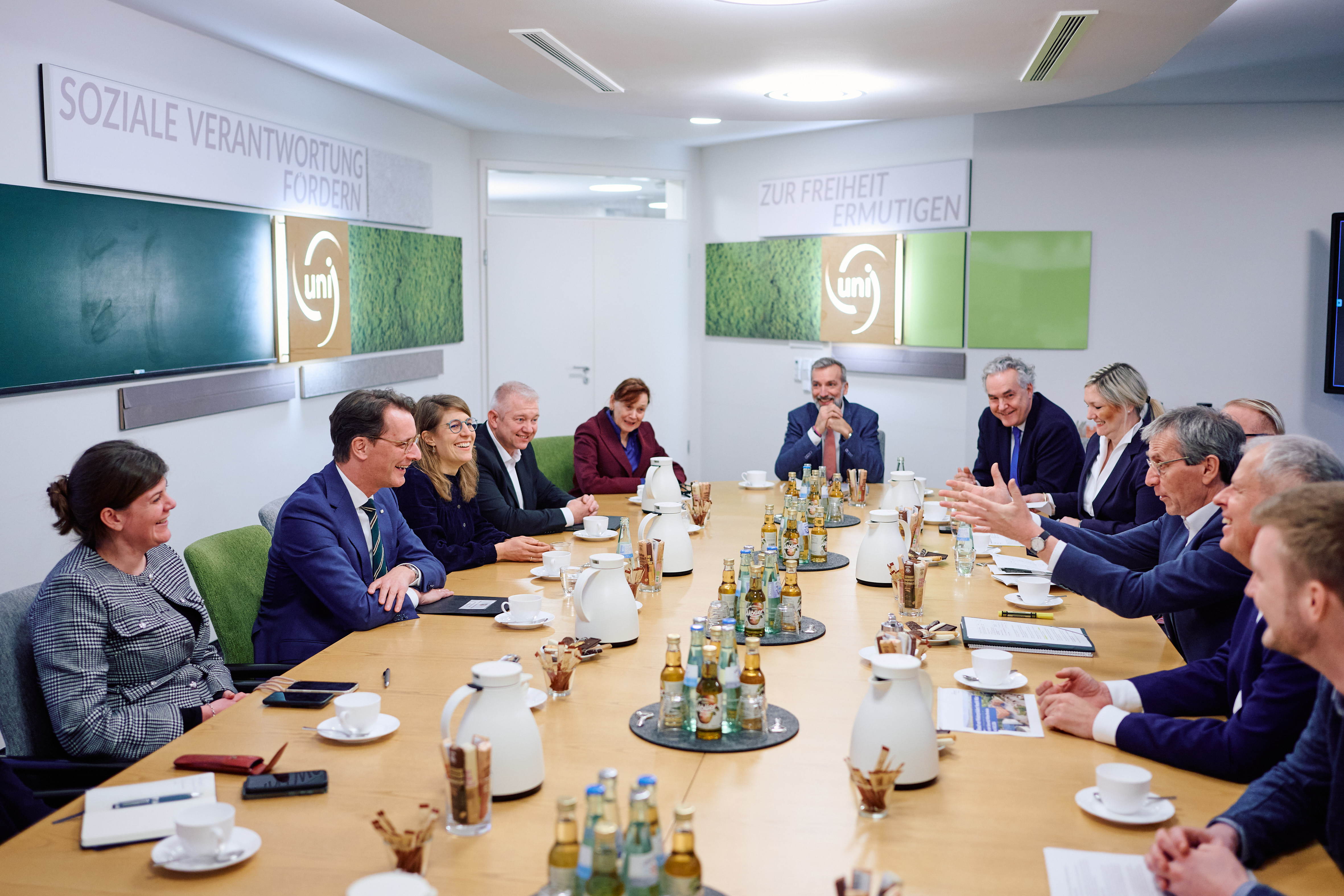 Mit dem Leitgedanken, neue Wege zu gehen und visionäre Ideen in der Bildungslandschaft zu verwirklichen, steht die Universität Witten/Herdecke (UW/H) seit mehr als 40 Jahren für einen besonderen Unternehmergeist. Bei einem Besuch an der UW/H kamen Hendrik Wüst, Ministerpräsident des Landes Nordrhein-Westfalen, Verena Schäffer, Fraktionsvorsitzende der Grünen im NRW-Landtag, und Dirk Leistner als neuer Bürgermeister der Stadt Witten nun mit Vertreter:innen der Universitätsleitung und Wissenschaftler:innen dazu ins Gespräch. Der Austausch bot Gelegenheit, zentrale Profilelemente der ersten privaten Universität Deutschlands vorzustellen, über aktuelle gesellschaftliche Themen in Lehre und Forschung zu sprechen sowie den Beitrag der UW/H zu landesweiten politischen Zielen – etwa die Stärkung des Wirtschafts- und Gesundheitsstandorts NRW, den Ausbau von Innovationen oder das Erreichen von Klimaneutralität – zu beleuchten.