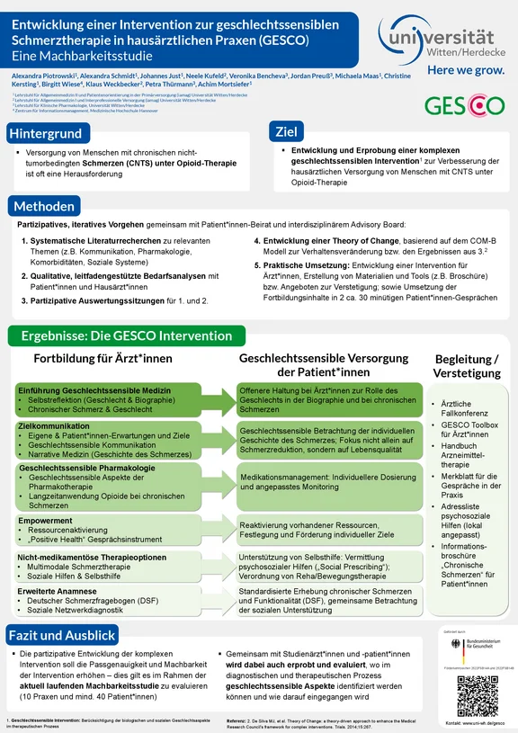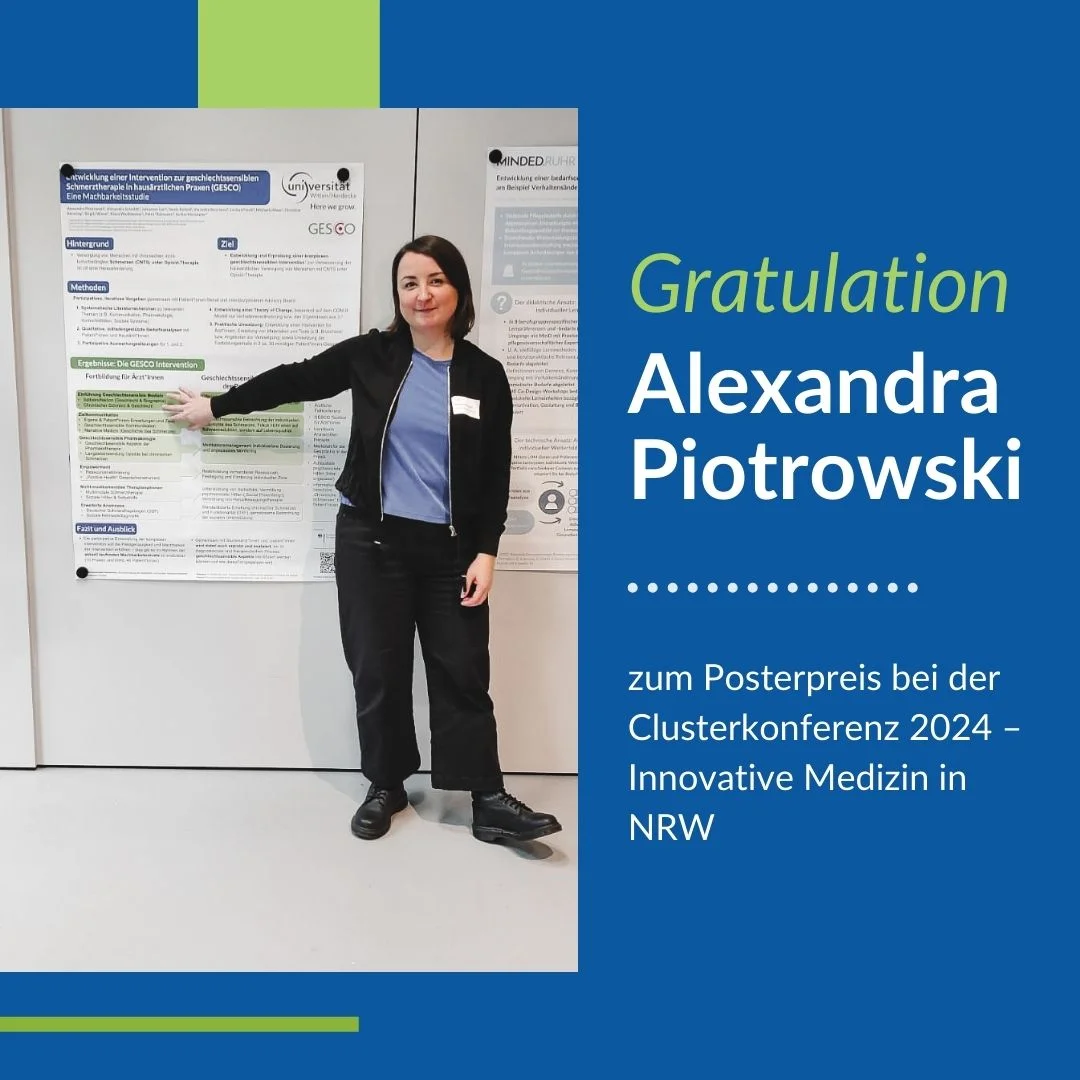 Mit unserem Projekt GESCO zur geschlechtssensiblen hausärztlichen Schmerztherapie erzielte Alexandra Piotrowski bei der diesjährigen „Clusterkonferenz 2024 – Innovative Medizin in NRW“ einen Posterpreis. Die Konferenz fand mit dem thematischen Schwerpunkt „Translation von Forschungsergebnissen in die Anwendung statt“, zu dem GESCO einen spannenden Beitrag leisten konnte. Inhalt des Posters bzw. Kurzvortrags war die partizipative Interventionsentwicklung, die eine Translation von Bedarfen der Beteiligten bzw. bestehender Forschung hin zu einem praktisch anwendbarem Versorgungskonzept darstellte.