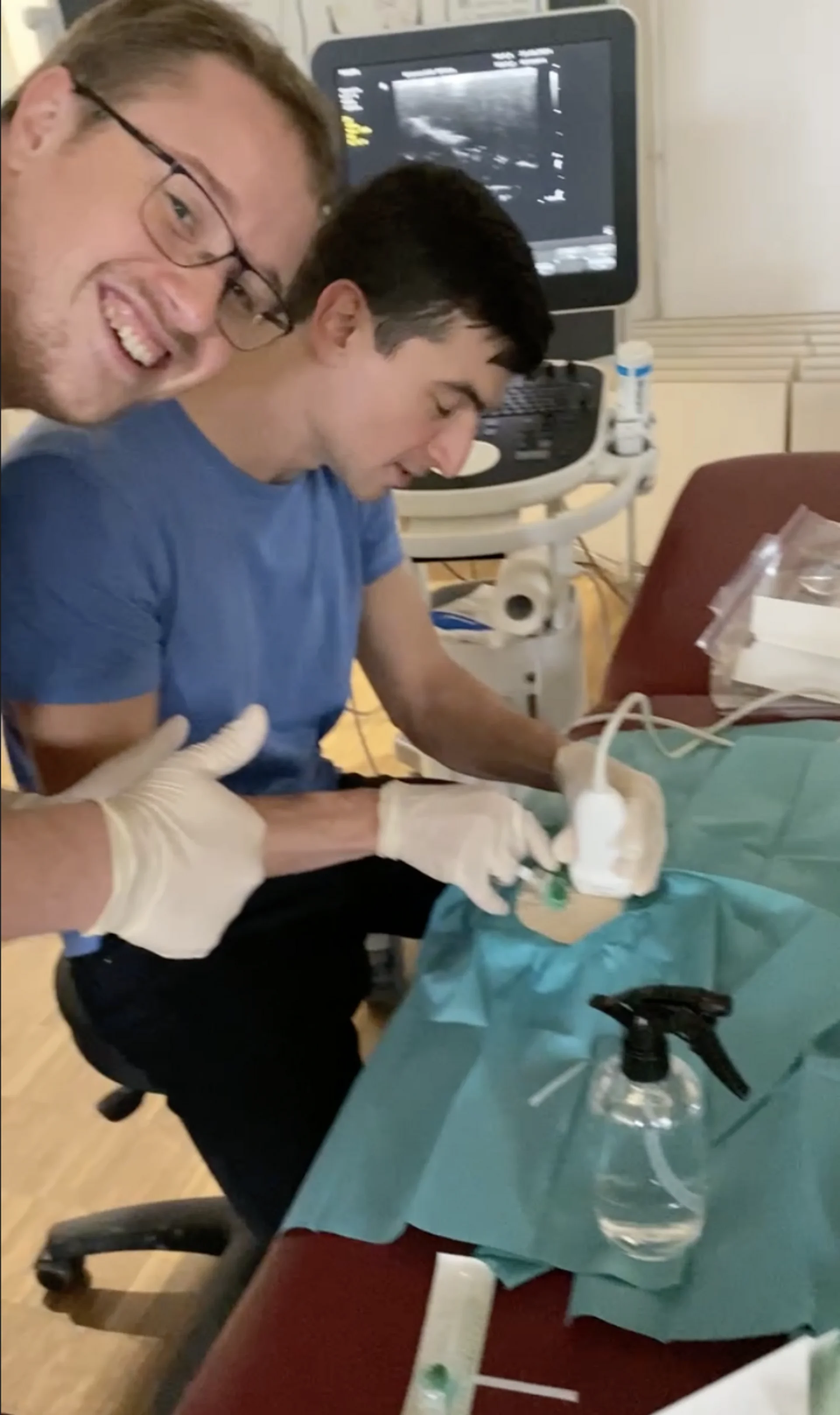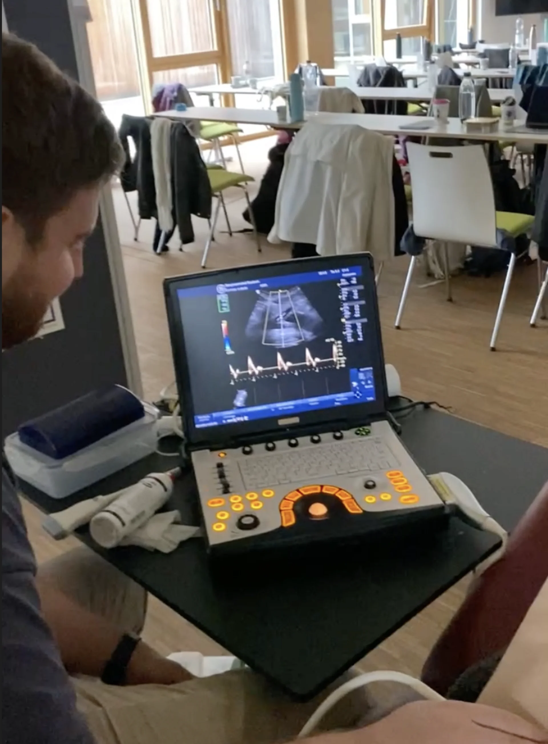 Der Kurs zeichnete sich durch eine besondere Lernatmosphäre aus: ultraschallbegeisterte Assistenz- und Oberärzt*innen des Bergmannsheil standen den Studierenden mit Rat und Tat zur Seite und frischten gleichzeitig ihre eigenen Kenntnisse in der abdominalen und echokardiographischen Notfallsonographie auf.
