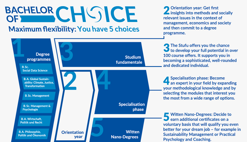 Der Studiengang „Management & Psychologie“ reiht sich ein in das deutschlandweit einzigartige Bachelor-of-Choice-Studienmodell. Dieses flexible Modell ermöglicht es Studierenden, sich in einen von sechs Studiengängen der Fakultät für Wirtschaft und Gesellschaft einzuschreiben. Nach einem gemeinsamen Orientierungsjahr, in dem allen Studienanfänger:innen dieselben relevanten Grundlagen vermittelt werden, können sie sich entsprechend ihrer individuellen Präferenzen final für einen Studiengang entscheiden – ohne dabei Credit Points oder Zeit zu verlieren.