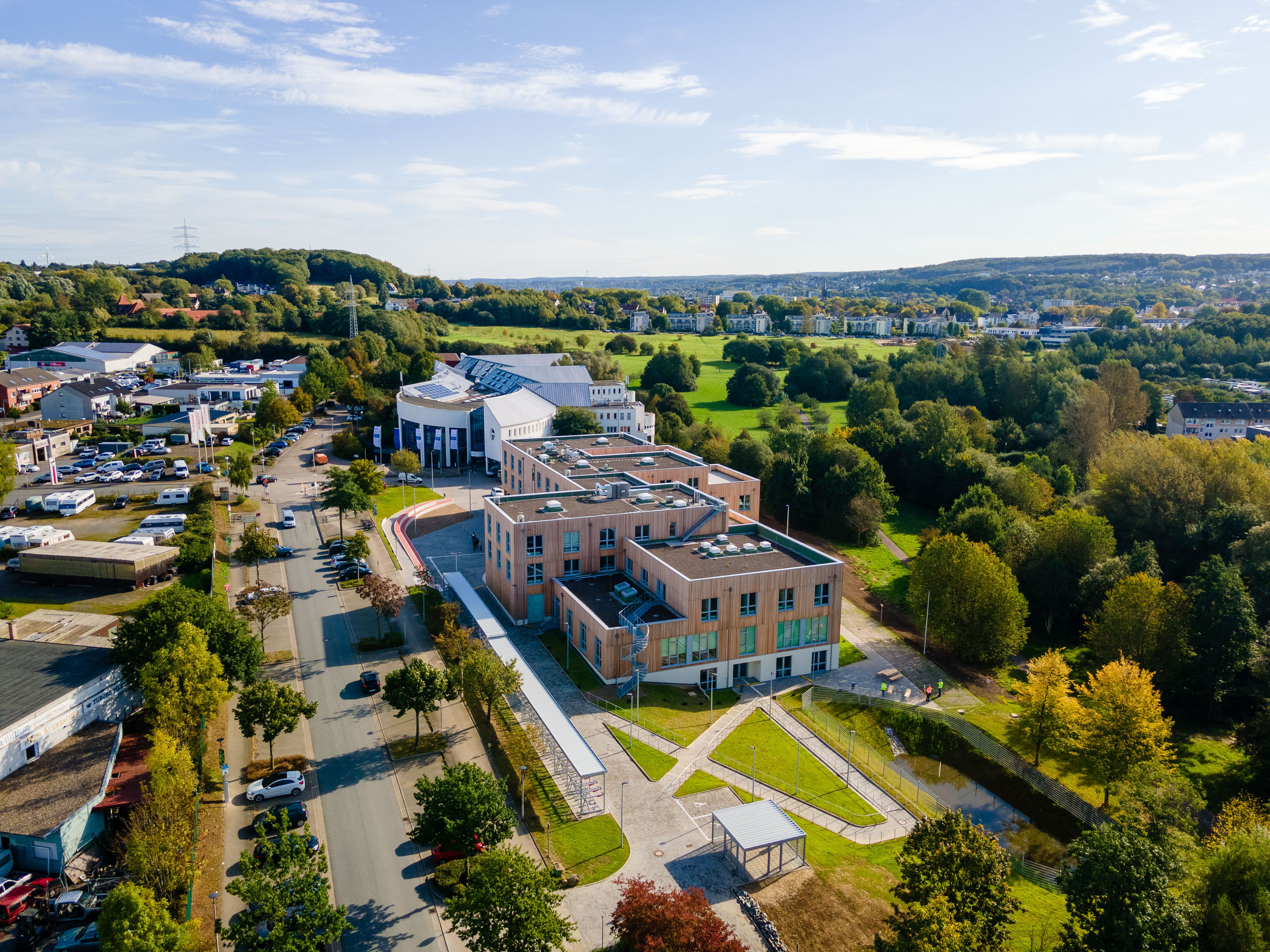 Um ihren Hauptcampus klimaneutral zu stellen, hat die Universität in den vergangenen Jahren zahlreiche Maßnahmen umgesetzt. So wurden die Klimaziele unter anderem bei der Konzeption und Planung des Gebäudes in Holzhybridbauweise, das 2021 eröffnet wurde, berücksichtigt; diese Planung zahlt sich bereits jetzt aus. Das Gebäude bindet rund 1.200 Tonnen CO2 langfristig im Holz. Zudem ist der Energieverbrauch durch eine intelligente Architektur in Verbindung mit einem Blockheizkraftwerk und durch die Energiegewinnung aus erneuerbaren Quellen, z. B. einer Photovoltaikanlage auf dem Dach, wesentlich geringer als in anderen Gebäuden.